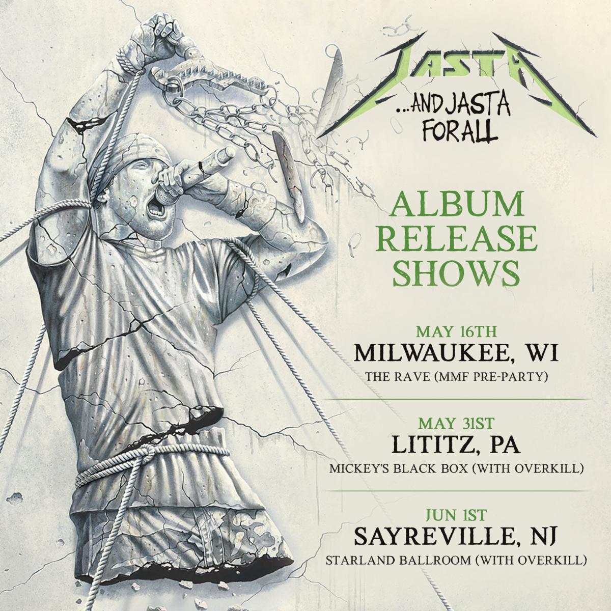 JASTA will be performing a series of album release shows for ‘AND JASTA FOR ALL,’ which will kick off at the official Milwaukee Metal Fest Pre-Party on May 16 at The Rave/Eagles Club and will feature special guests Bobby Blitz (Overkill), Steve “Zetro Souza” (Exodus), Bobby Hambel (Biohazard), Hoya Roc (Smoke AD, ex-Madball), and more surprises! Milwaukee Metal Festival pass holders will be given access to the pre-party in addition to all three days, while single tickets are available for those who are not attending the full festival. Tickets can be found HERE.