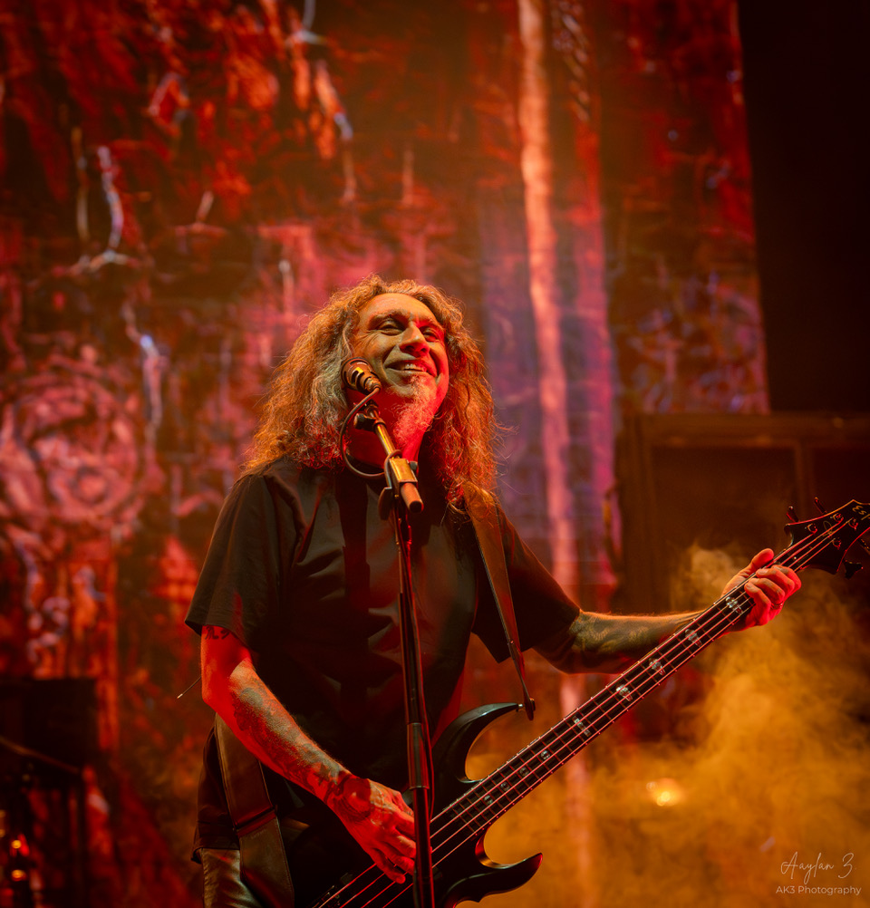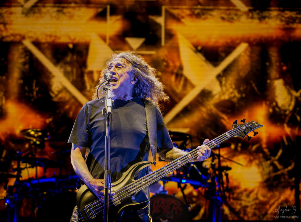 After that, Araya took a moment to respond to a fan yelling out their love for the band. He smiled and reminded everyone that the band loved their fans and were just as grateful to be there and have the amount of support that has shown for them. He then dedicated the next song to his wife of 30 years, one of Slayer’s love songs, Dead Skin Mask. The song was accompanied by disturbing visuals behind Holt and King as they traded riffs and solos as masters of horror sounding metal. Spirit in Black and Hate