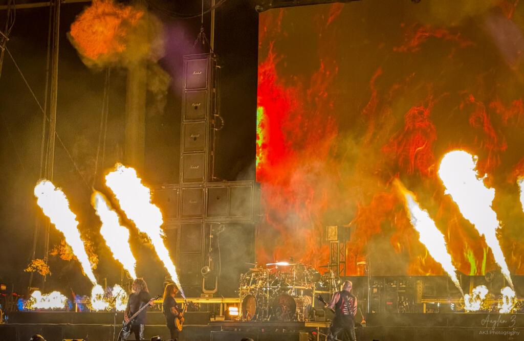 closed the night with one of their most scrutinized yet defining songs, Angel of Death.  The production team also deserves credit for elevating the show. Pyrotechnics during songs like Jihad, War Ensemble, Born of Fire, and Hell Awaits were flawless. Slayer demands fire, and they delivered plenty. The visuals of gore, war, and some of the iconic Slayer artwork were blended perfectly. Dead Skin Mask and Mandatory Suicide standing out among the rest. The audio team kept the sound crisp and balanced, while the lighting crew matched every moment with flawless timing and color synchronization.  After a 20-song set, I believe Araya’s smile says it all. Slayer’s return to touring is fueled by their genuine love for playing for their fans. Add in the fact that they still sound incredible while delivering a visually stunning show, and it was truly an unforgettable experience.