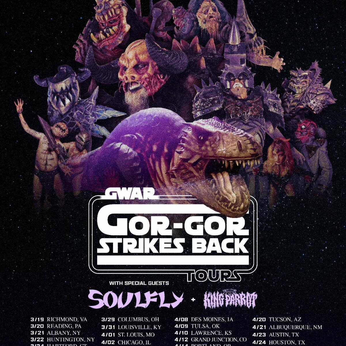 This Thursday, intergalactic shock rock legends GWAR return to destroy stages across the United States on The Gor Gor Strikes Back Tour, a massive spring run featuring Soulfly as direct support and King Parrot opening every night. The carnage begins in their adopted hometown of Richmond, VA, and rampages through April 29th, ending in Charlotte, NC. A complete list of dates is below. Armed with fresh atrocities, new victims, and the unstoppable might of Gor Gor himself, GWAR are promising their most crushing live spectacle yet.