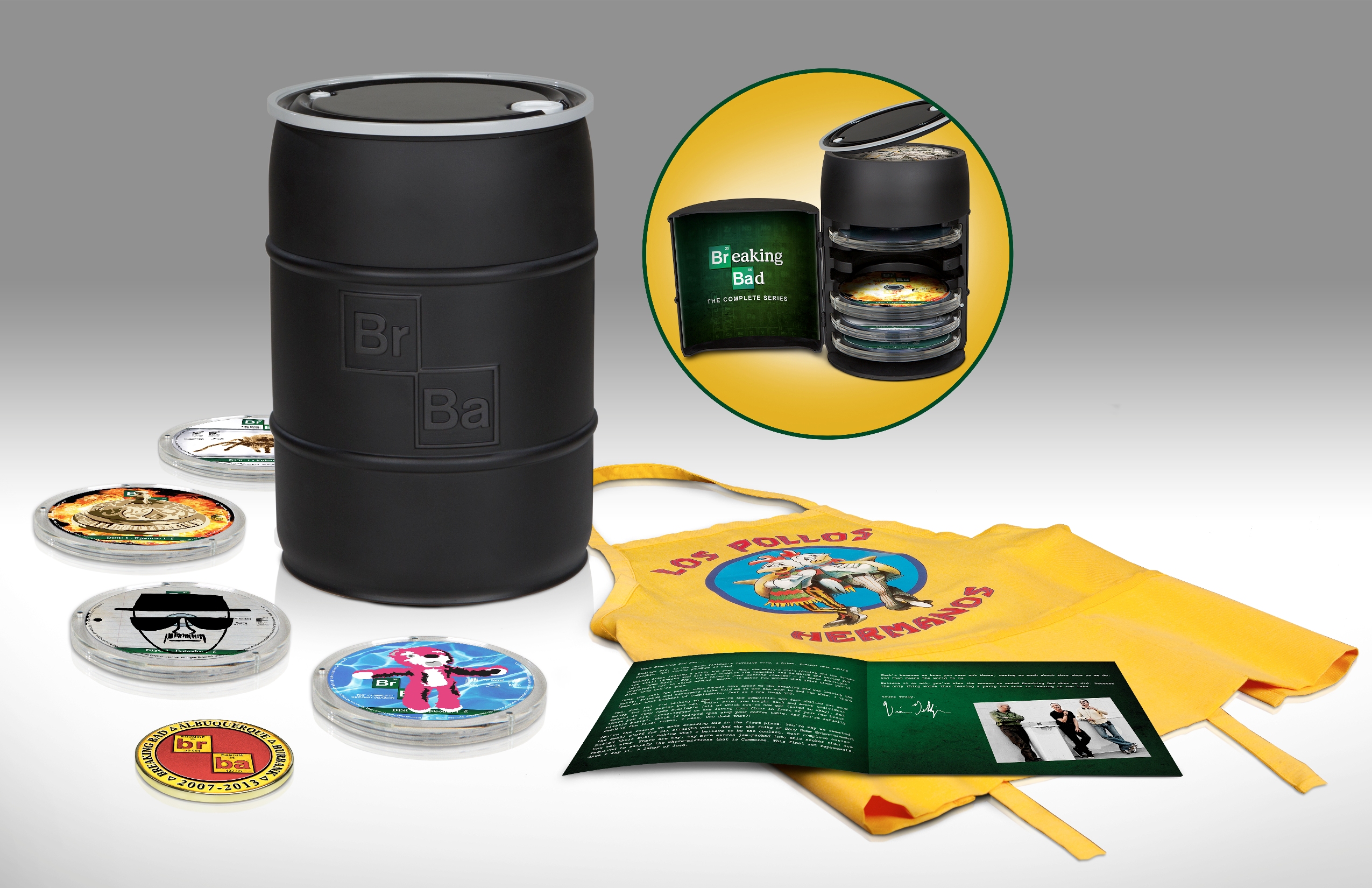Fans who are addicted to the series and itching for another hit can now indulge in more than two-hours of never-before-seen footage in a ground-breaking series documentary exclusively in the box set, which comes packaged in a collectible replica barrel representing part of Walter Whites dark legacy. The all-new documentary chronicles the making of the final season, from filming the first table read to the very last day on set and everything in between, including Bryan Cranston inviting the camera in to his Albuquerque living room for the first reading of the final script with Aaron Paul. The box set also contains all bonus features from previously released seasons (including retail exclusives formerly only available in select stores), a Los Pollos Hermanos apron and a collectible booklet with a letter from Gilligan, as well as a commemorative Breaking Bad challenge coin designed and created by Gilligan exclusively for this set as a token of appreciation to fans for making the Breaking Bad journey.