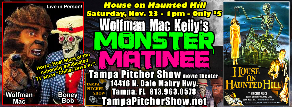 The presentation will be hosted by nationally known horror host Wolfman Mac Kelly. Kelly is probably best known as the host of the long running syndicated television program “Chiller Drive-In.” The screening begins promptly at 1:00 p.m. For more information go to www.tampapitchershow.net